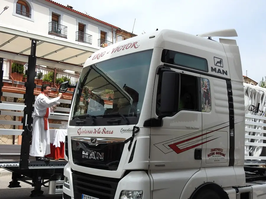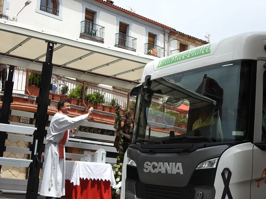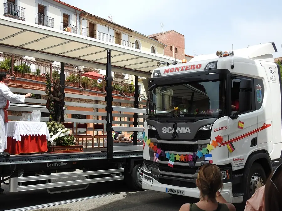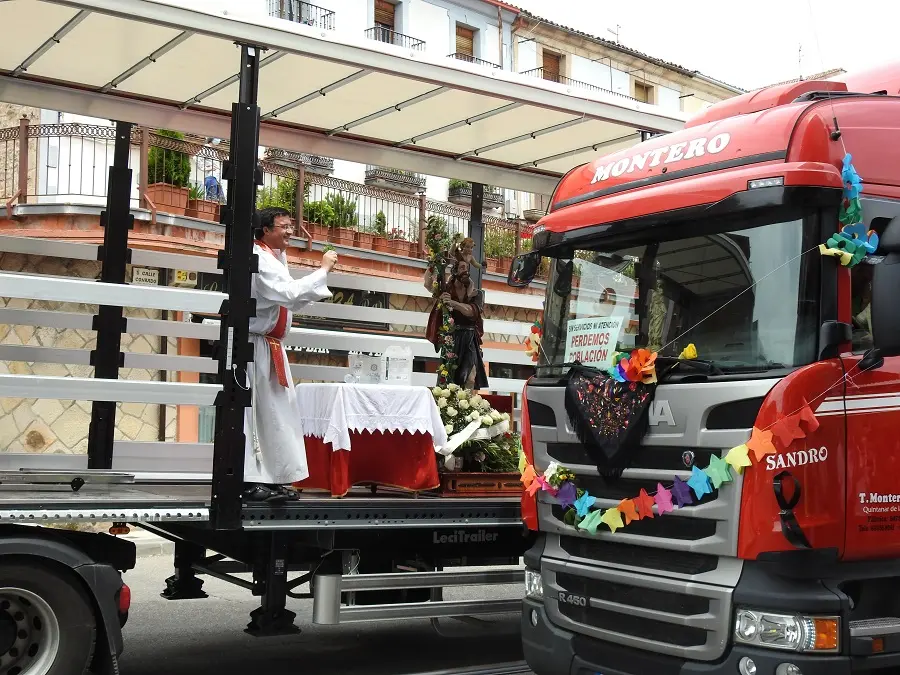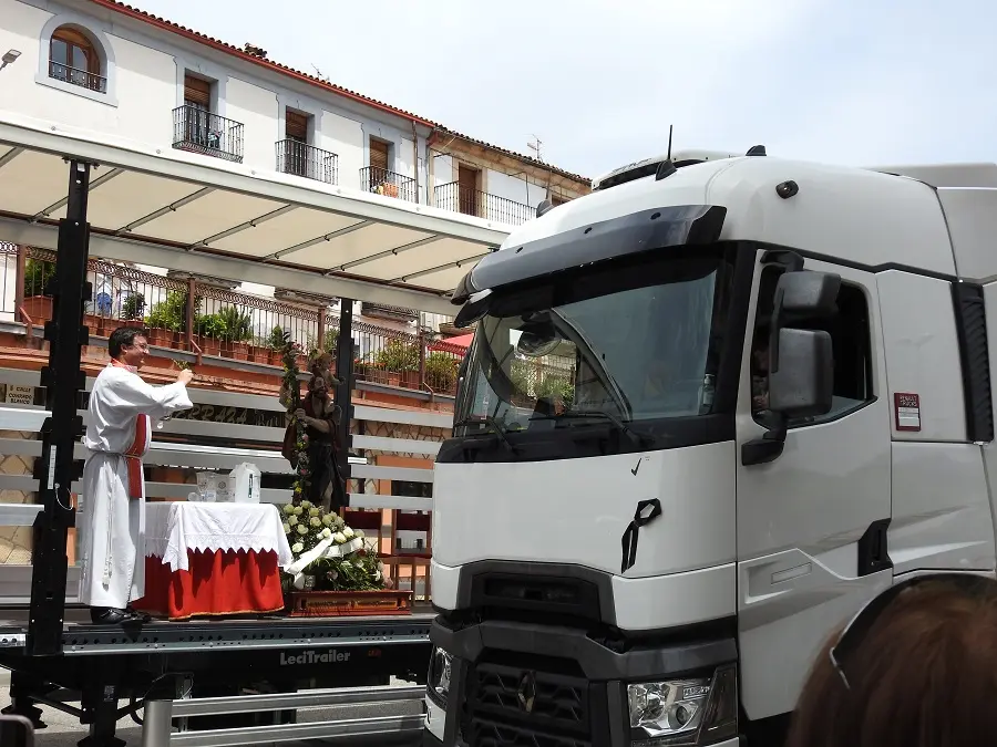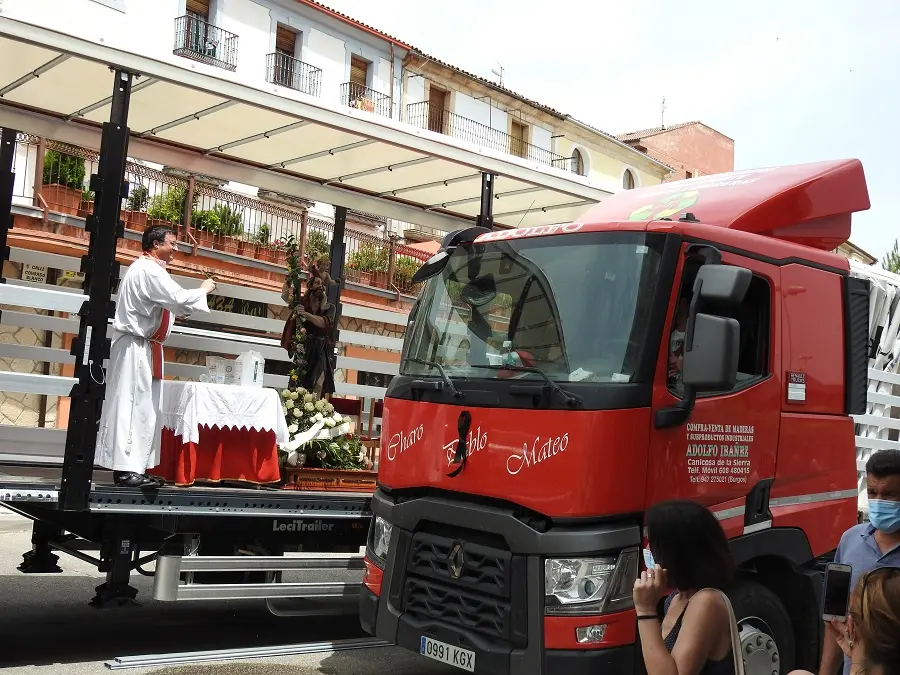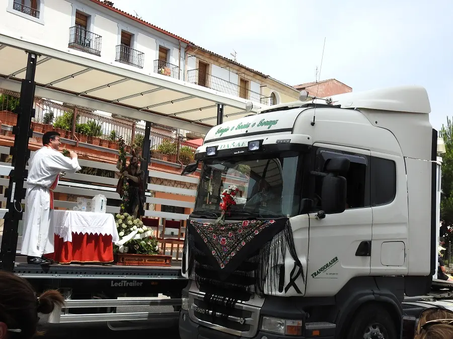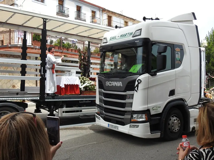 El camión con la plataforma sobre la que se ofició la ceremonia, de la empresa Félix De Miguel e Hijos, lucía el crespón negro por el fallecimiento en accidente de tráfico de Miguel Aránega María, transportista y uno de los colaboradores en esta fiesta. La Hermandad de Conductores encargó una misa que tuvo lugar en la parroquia de San Cristobal en la tarde del sábado 10 de julio.