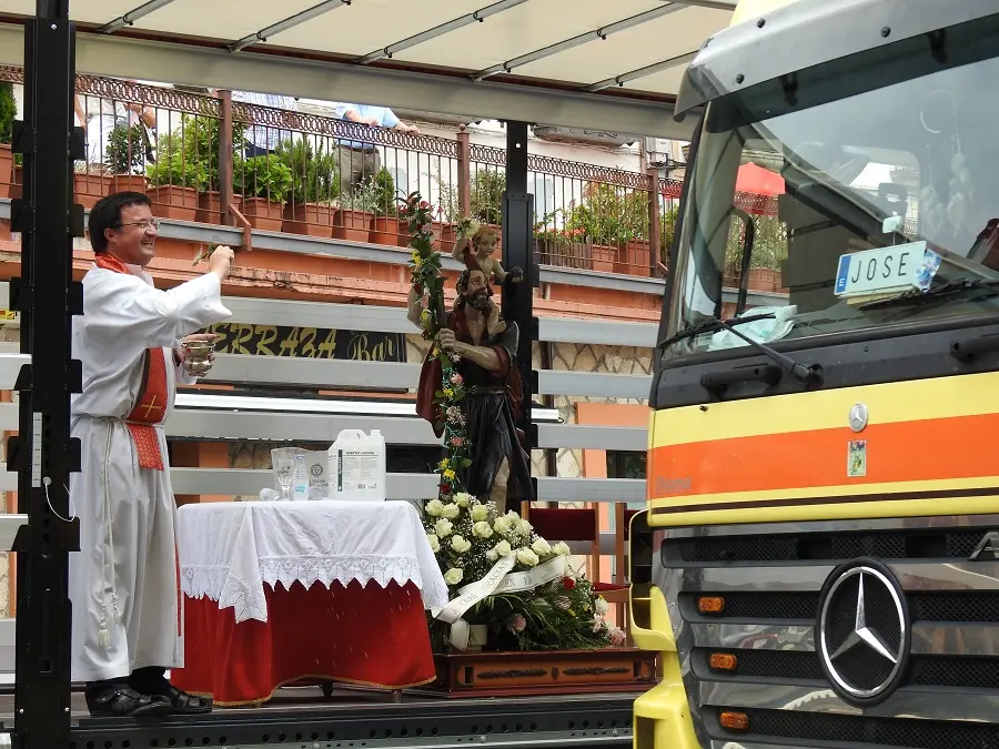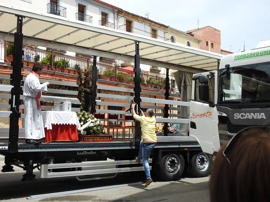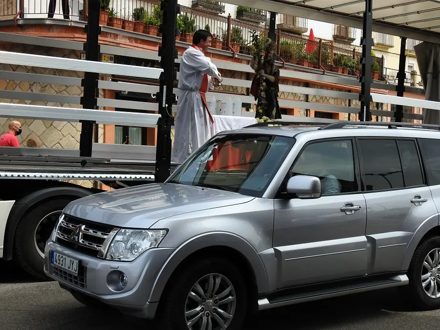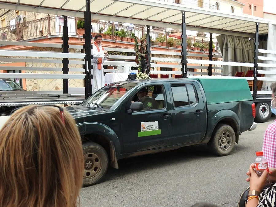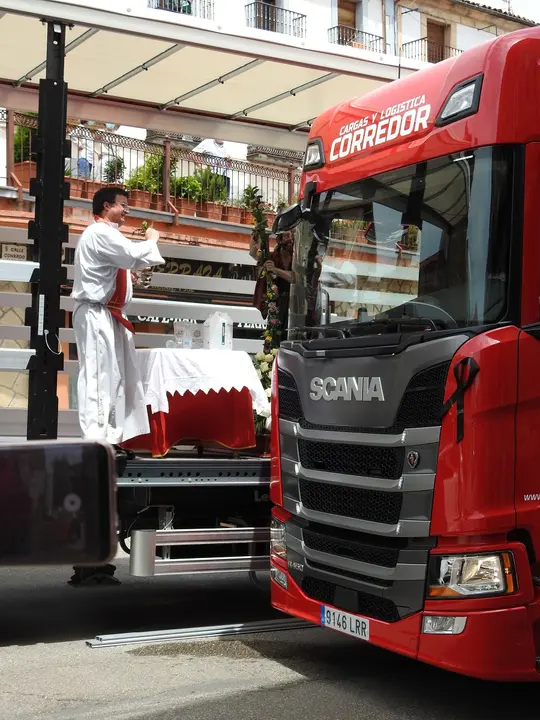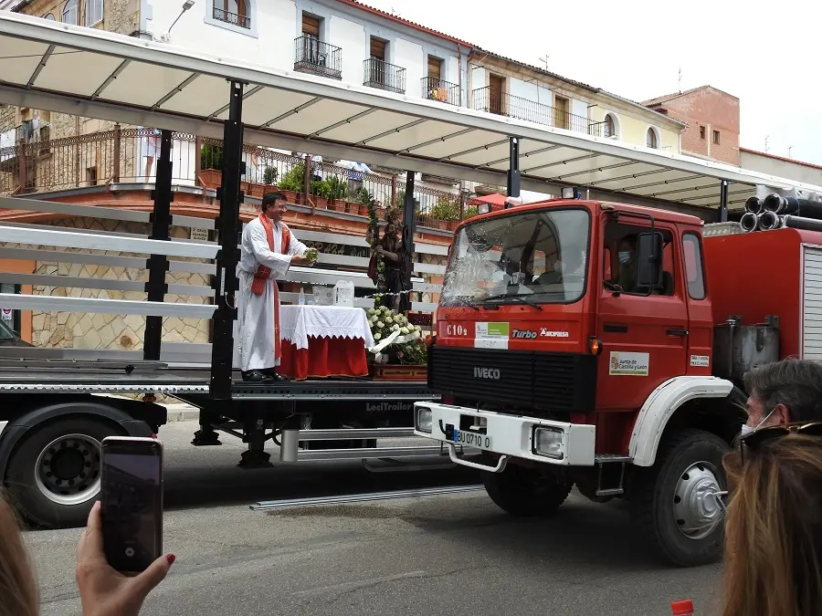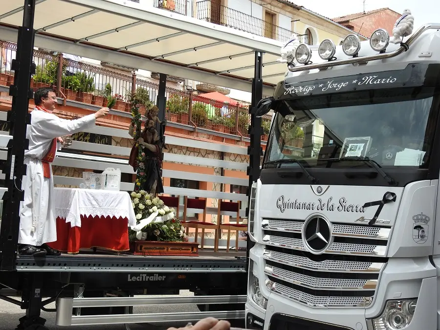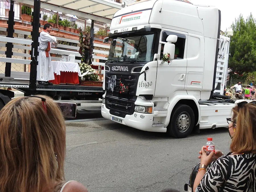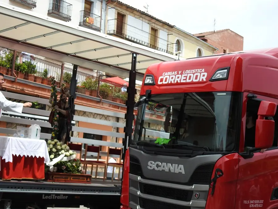 El camión con la plataforma sobre la que se ofició la ceremonia, de la empresa Félix De Miguel e Hijos, lucía el crespón negro por el fallecimiento en accidente de tráfico de Miguel Aránega María, transportista y uno de los colaboradores en esta fiesta. La Hermandad de Conductores encargó una misa que tuvo lugar en la parroquia de San Cristobal en la tarde del sábado 10 de julio.