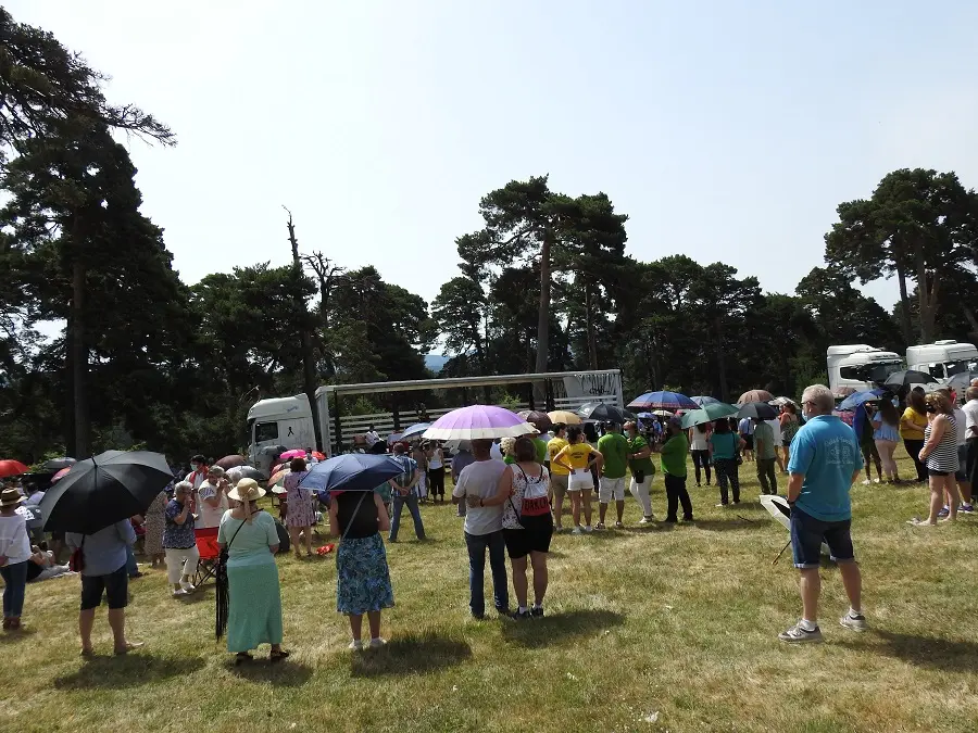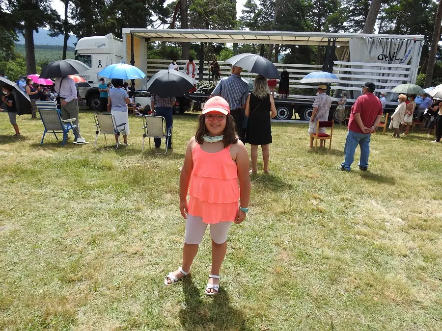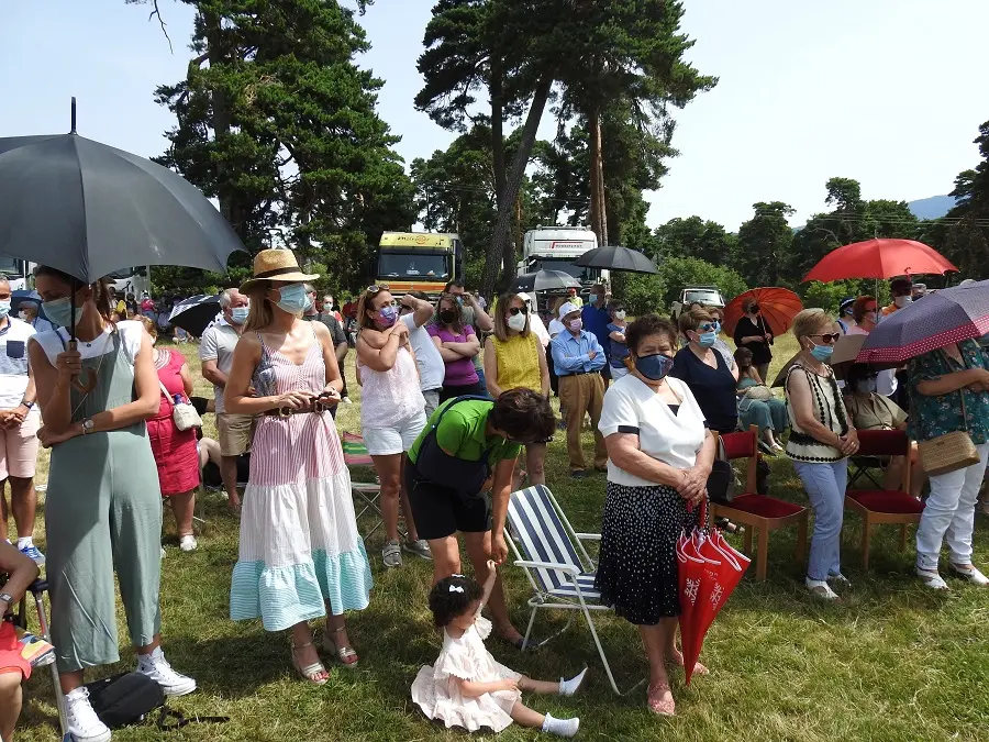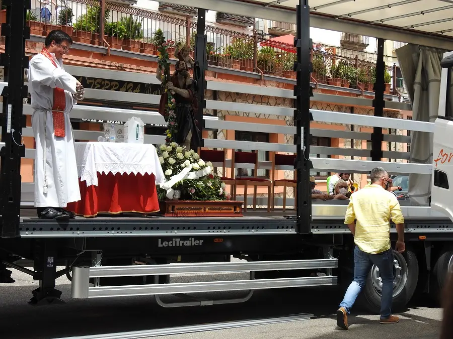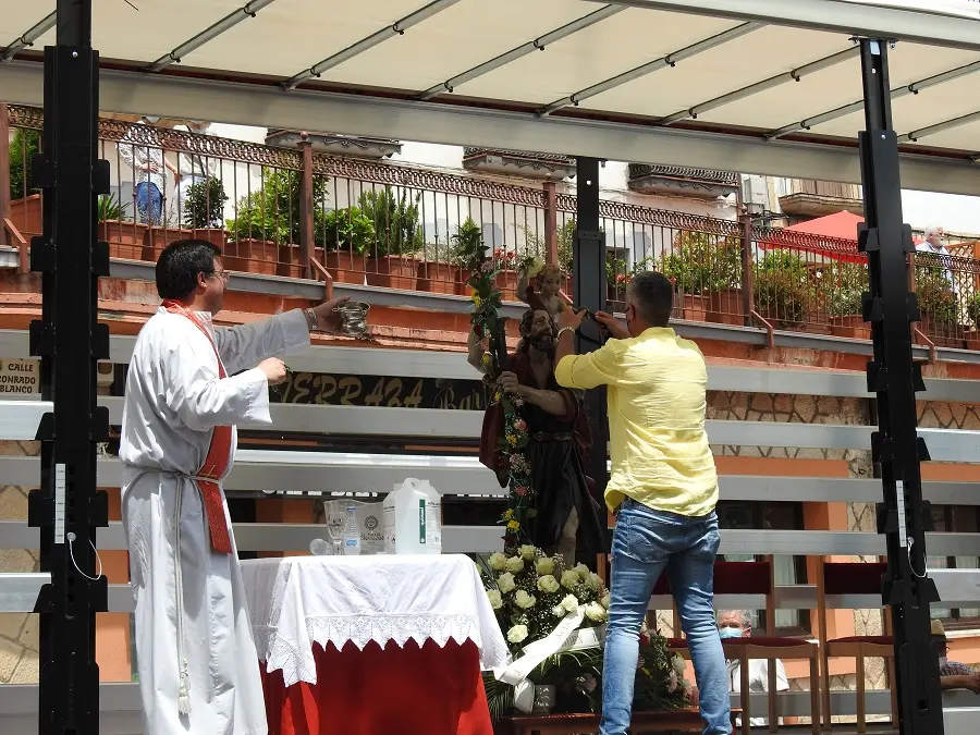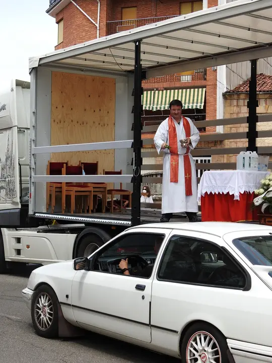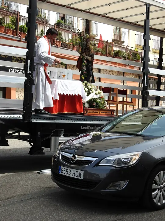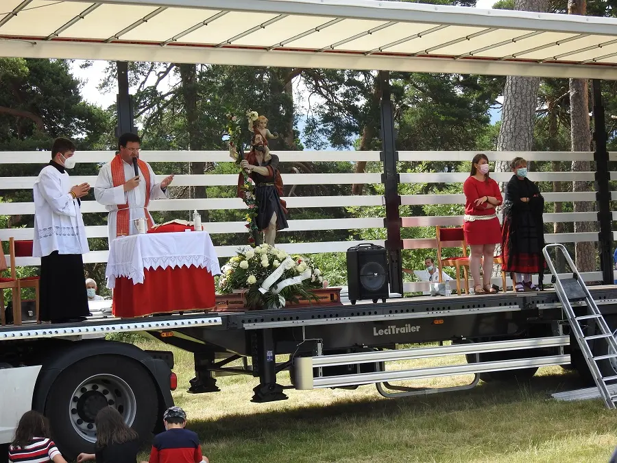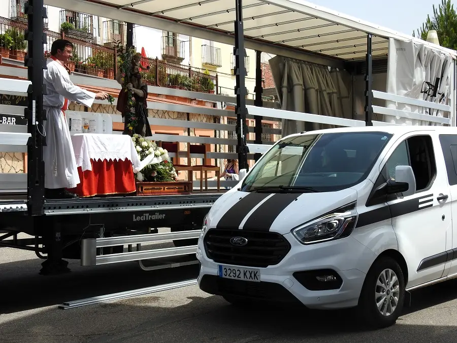El camión con la plataforma sobre la que se ofició la ceremonia, de la empresa Félix De Miguel e Hijos, lucía el crespón negro por el fallecimiento en accidente de tráfico de Miguel Aránega María, transportista y uno de los colaboradores en esta fiesta. La Hermandad de Conductores encargó una misa que tuvo lugar en la parroquia de San Cristobal en la tarde del sábado 10 de julio.