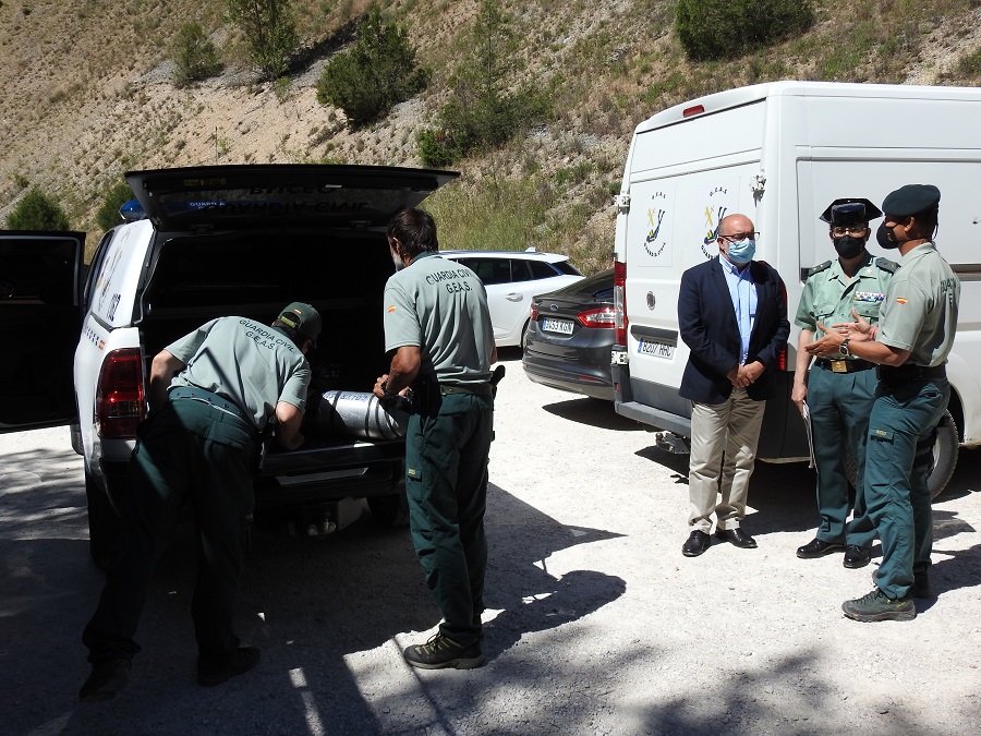 El subdelegado del Gobierno en Soria, Miguel Latorre, ha asistido esta mañana en el manantial natural de La Fuentona, en Cabrejas del Pinar, acompañado por el teniente coronel jefe de la Comandancia de Soria, Andrés Velarde, a las prácticas que allí realiza un equipo de Valladolid del Grupo Especial de Actividades Subacuáticas (GEAS) de la Guardia Civil.