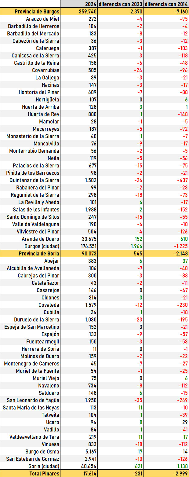 En el gráfico que ilustra la noticia se puede percibir cómo los diez municipios más poblados de Pinares han perdido habitantes a lo largo de la última década. A excepción de unos pocos pueblos de menos de 150 habitantes, no se salva ninguno del descenso de población frente a los datos del año 2014, justo hace una década.