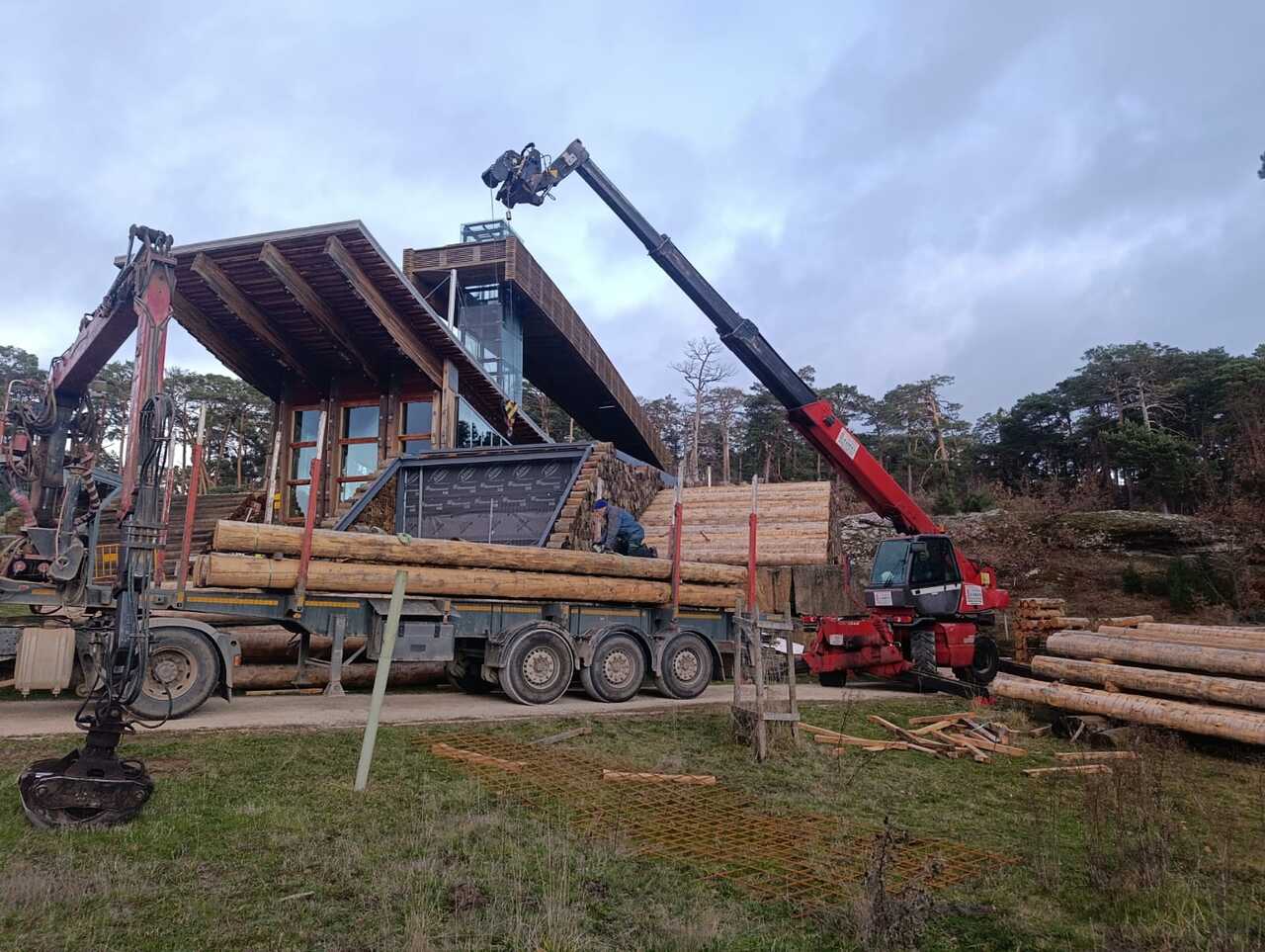 Los trabajos de colocación de nuevos troncos en la Casa de la Madera se ejecutan con la maquinaria precisa