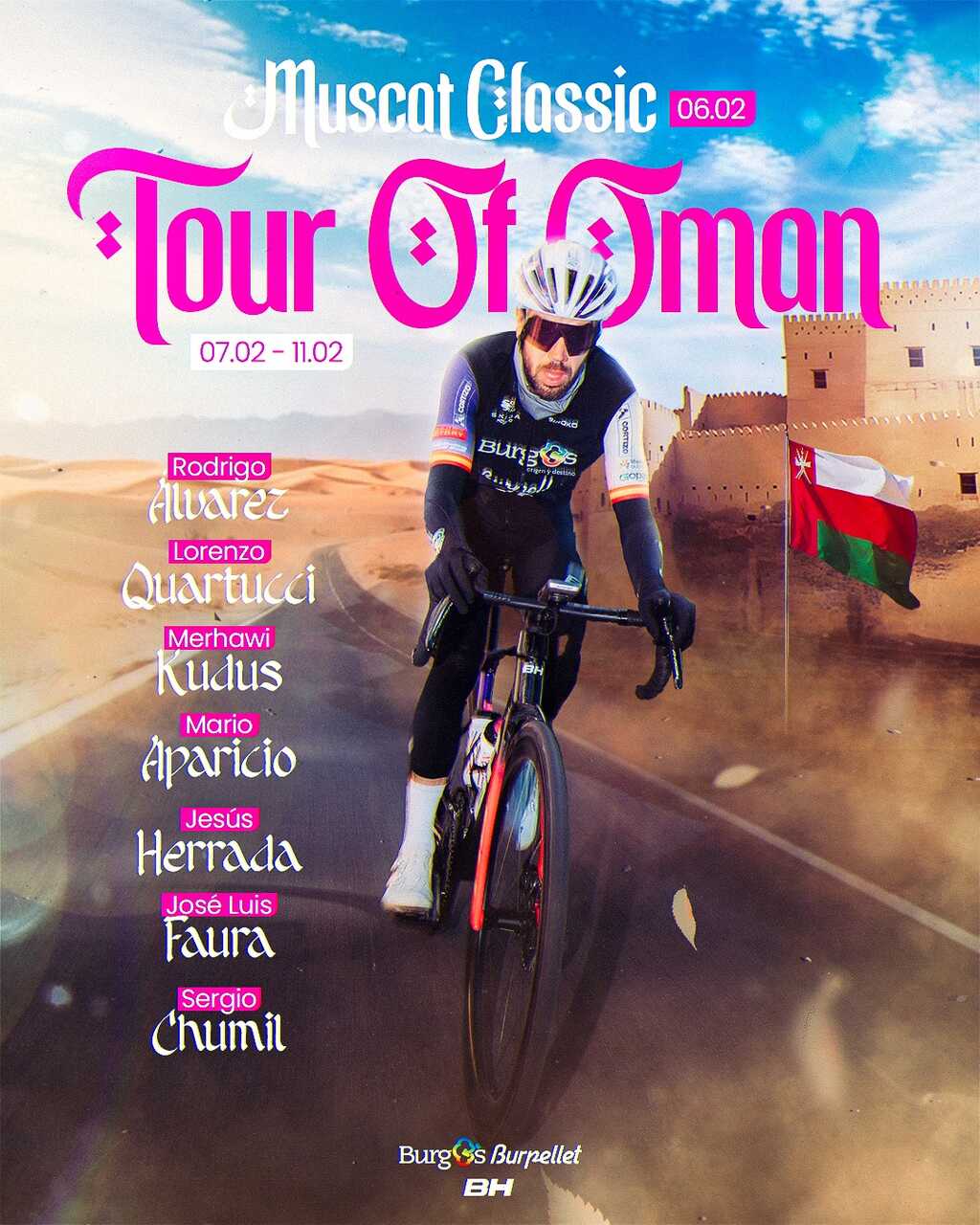 El Burgos Burpellet BH presentará la misma alineación en las dos pruebas omaníes. Sergio Chumil, Jesús Herrada, Mario Aparicio, José Luis Faura y Merhawi Kudus serán los escaladores que pelearán por los triunfos de etapa y por acabar lo mejor posicionados posible en la clasificación general. Lorenzo Quartucci intentará aprovechar su punta de velocidad en las llegadas para puncheurs, mientras que Rodrigo Álvarez, que fue protagonista en 2025 en las escapadas, será el hombre rápido que peleará los sprints de etapas llanas.