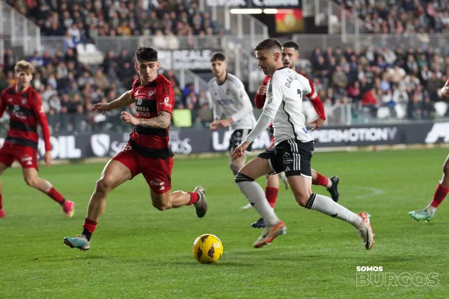 Con tres centros al área del Burgos CF que levantaron los primeros ‘uy’ de la grada arrancó el derbi burgalés en El Plantío. El ritmo de los blanquinegros fue arrollador en el inicio y el doble remate de Matos en el 5’ dejó claro que el juego ofensivo en el primer tiempo solo tendría un autor. Y aunque el Mirandés se aprovechó de la velocidad de sus extremos para llegar al área, las mejores ocasiones del primer tiempo corrieron a cargo de Álex Sancris en el 33’ con un disparo de zurda tras una gran jugada colectiva al primer toque y de Mumo, quien lo probó con un remate de primeras que no cogió portería.