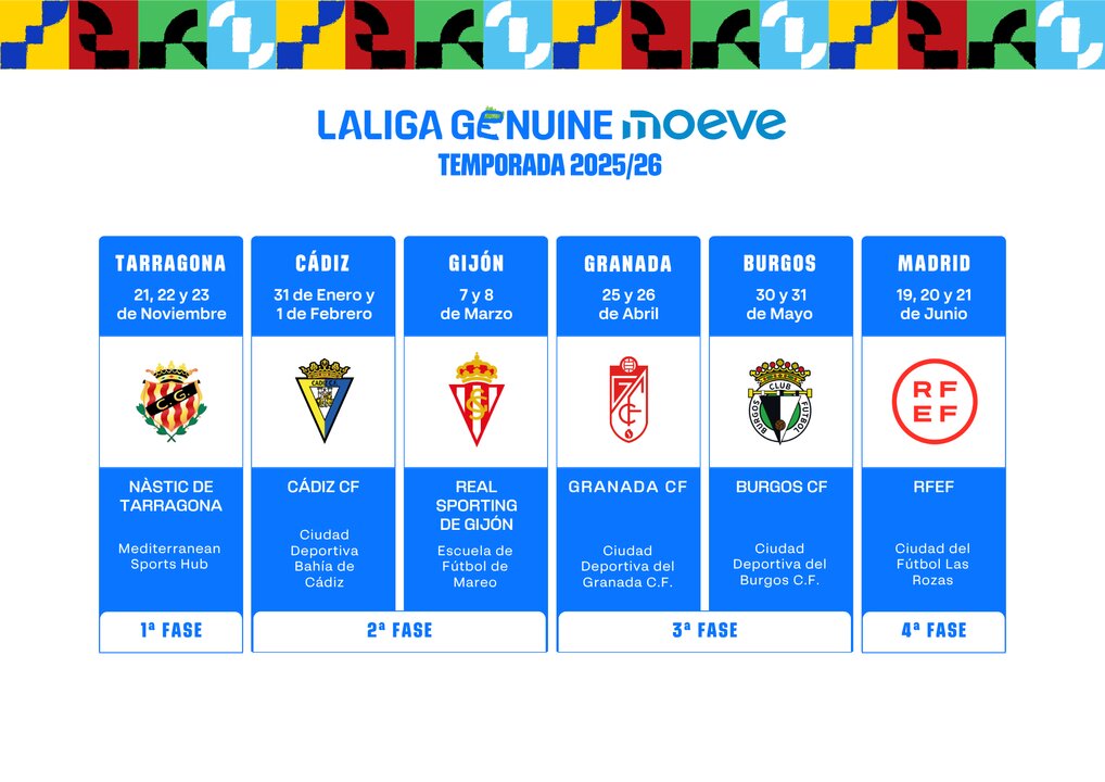 El campeonato se dividirá en cuatro fases, con seis sedes distintas. LALIGA GENUINE Moeve arrancará en Tarragona con su primera fase durante los días 21, 22 y 23 de noviembre. La segunda fase tendrá dos sedes: Cádiz, donde se competirá en los días 31 de enero y 1 de febrero, y Gijón, en los días 7 y 8 de marzo. En la tercera fase, Granada será la primera sede, durante los días 25 y 26 de abril, y Burgos la segunda, durante los días 30 y 31 de mayo. La competición se cerrará en Madrid, en la Ciudad Deportiva de Las Rozas, donde se disputará la cuarta y última fase del torneo durante los días 19, 20 y 21 de junio.