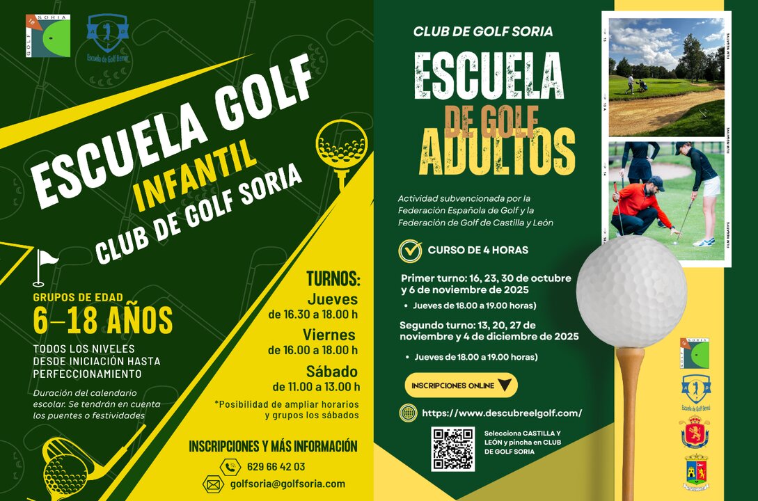 En cuanto a la Escuela de Adultos, se trata de una actividad subvencionada por la Federación Española de Golf y por la Federación de Golf de Castilla y León. Ofrece un curso de 4 horas y la posibilidad de acogerse a 2 turnos: el primero, los días 16, 23 y 30 de octubre y 6 de noviembre (jueves de 18.00 a 19.00 horas), y el segundo, los días 13, 20 y 27 de noviembre y 4 de diciembre (jueves de 18.00 a 19.00 horas). En este caso, las personas interesadas en inscribirse pueden hacerlo a través de la web https://www.descubreelgolf.com/ y acceder a los directorios Castilla y León / Club de Golf Soria.