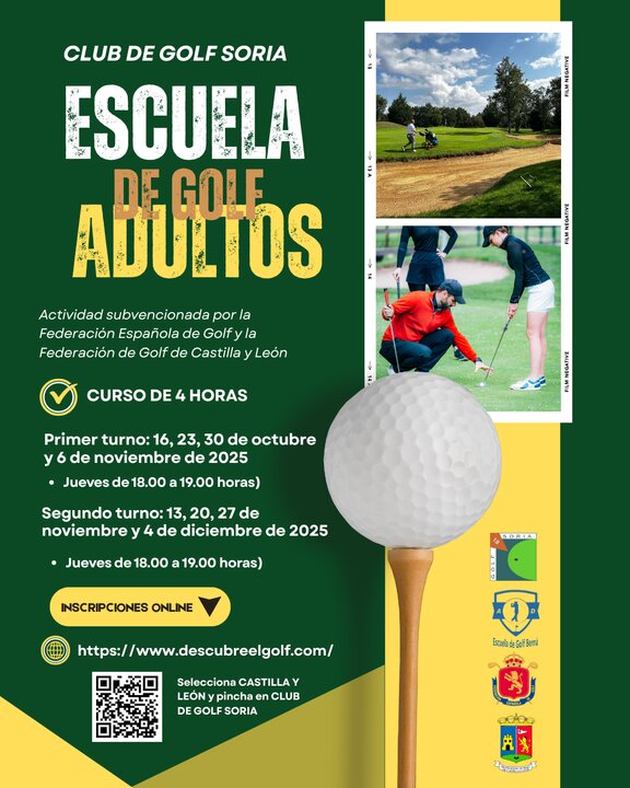 En cuanto a la Escuela de Adultos, se trata de una actividad subvencionada por la Federación Española de Golf y por la Federación de Golf de Castilla y León. Ofrece un curso de 4 horas y la posibilidad de acogerse a 2 turnos: el primero, los días 16, 23 y 30 de octubre y 6 de noviembre (jueves de 18.00 a 19.00 horas), y el segundo, los días 13, 20 y 27 de noviembre y 4 de diciembre (jueves de 18.00 a 19.00 horas). En este caso, las personas interesadas en inscribirse pueden hacerlo a través de la web https://www.descubreelgolf.com/ y acceder a los directorios Castilla y León / Club de Golf Soria.