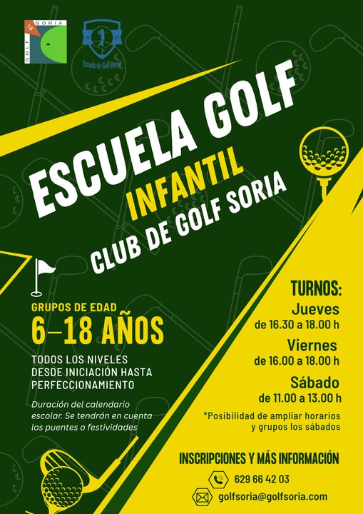 En el caso de la Escuela Infantil, va dirigida a niños y jóvenes de edades comprendidas entre los 6 y los 18 años, y cubre todos los niveles, desde iniciación hasta perfeccionamiento. La actividad tiene previsto celebrar tres turnos: los jueves de 16.30 a 18.00 horas, los viernes de 16.00 a 18.00 y los sábados de 11.00 a 13.00, aunque en el caso de los sábados existe la posibilidad de ampliar horarios y grupos. La Escuela se desarrollará durante el calendario escolar y estará sujeta a las festividades y a los posibles puentes que existan. Las personas interesadas pueden solicitar más información e inscribirse a través del teléfono 629 66 42 03 o del correo electrónico golfsoria@golfsoria.com.