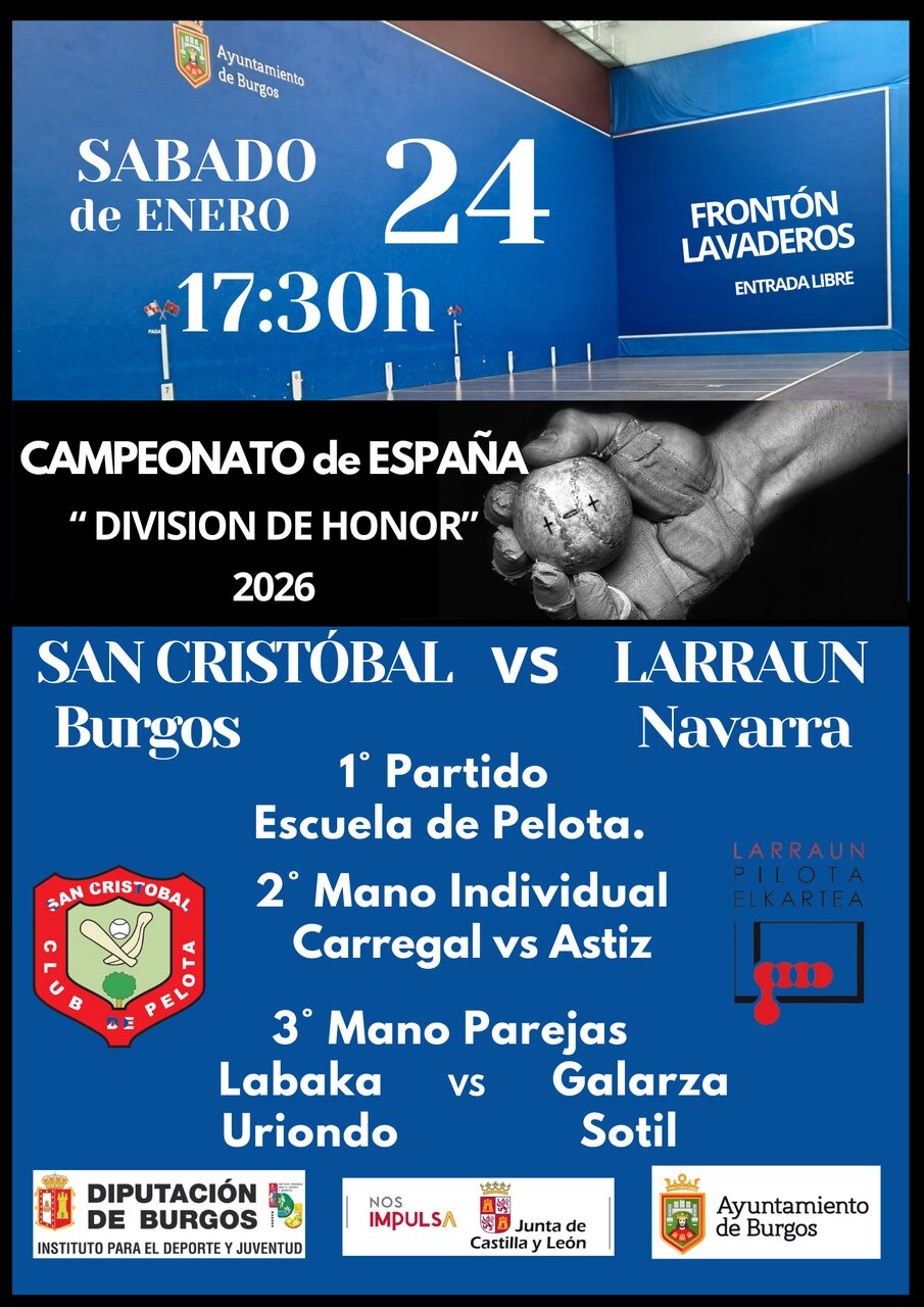 El próximo sábado, día 24 de enero, a las 17:30 horas, el frontón de Lavaderos acogerá una nueva jornada de la División de Honor, con el siguiente programa: