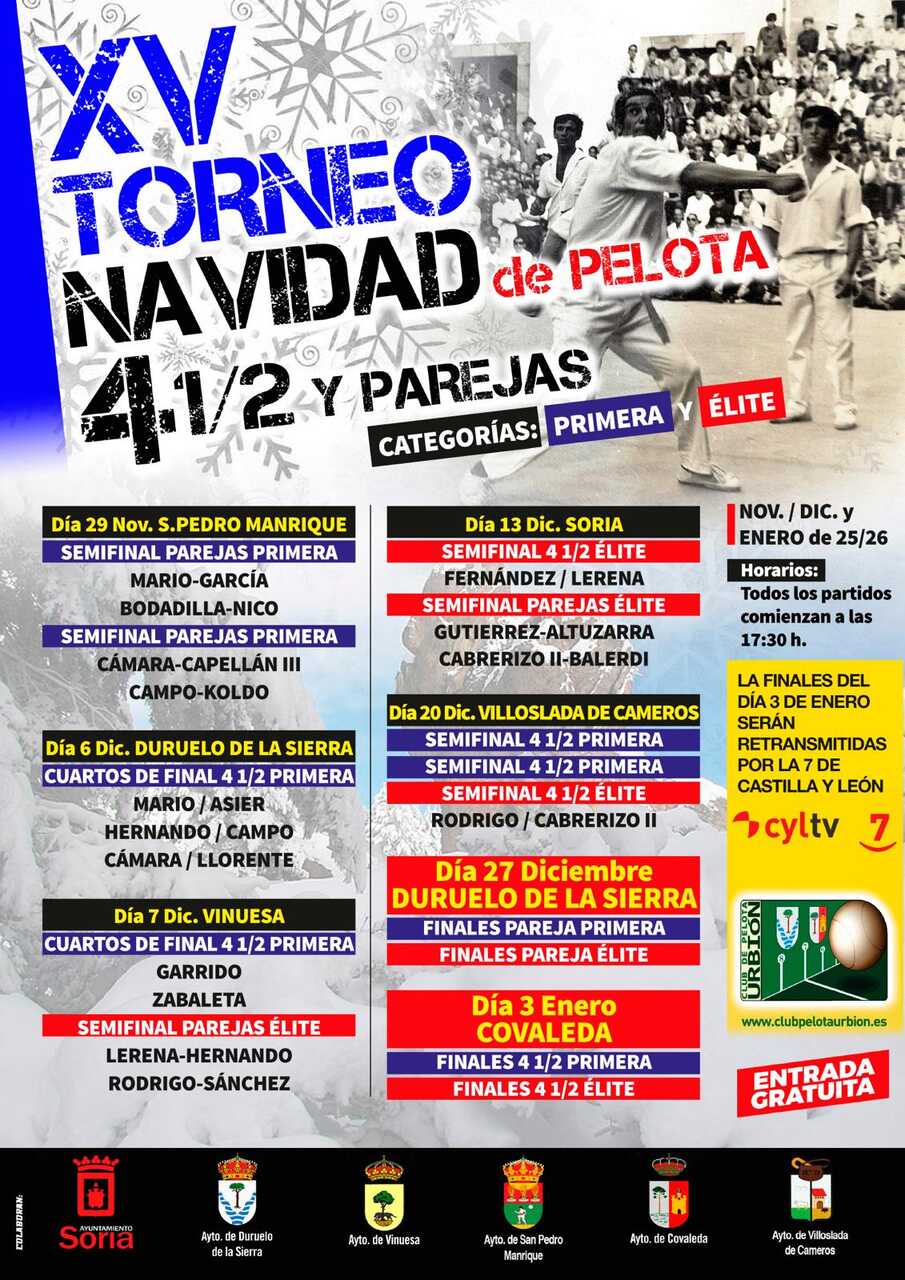 Este año se celebrará el XV Trofeo de Navidad del 4 1/2 de Pelota a Mano, en la zona de Pinares de Soria, organizado por el Club de Pelota Urbión, y con la colaboración de los ayuntamientos de los pueblos implicados.