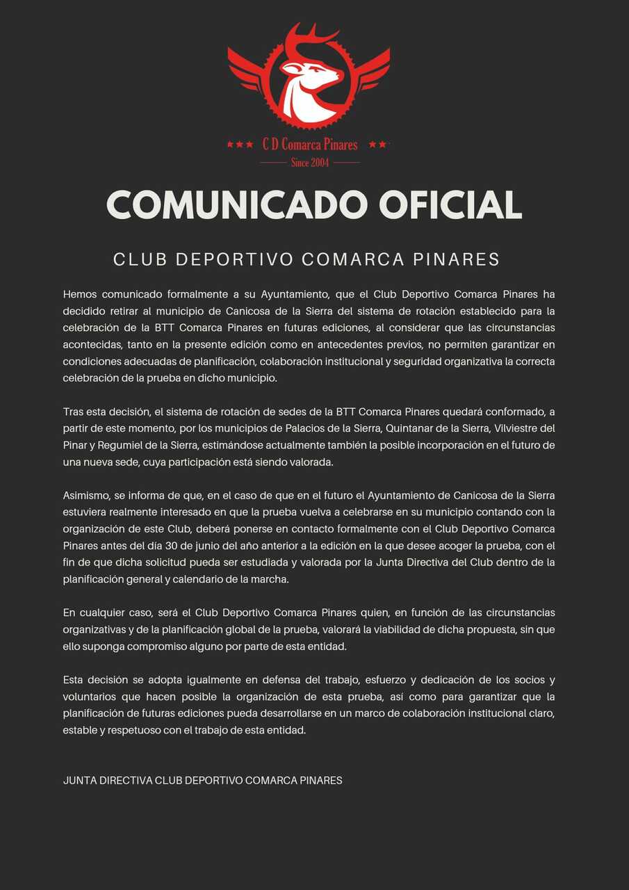 Comunicado oficial del Club Deportivo Comarca Pinares respecto a la realización de la Ruta BTT Comarca Pinares