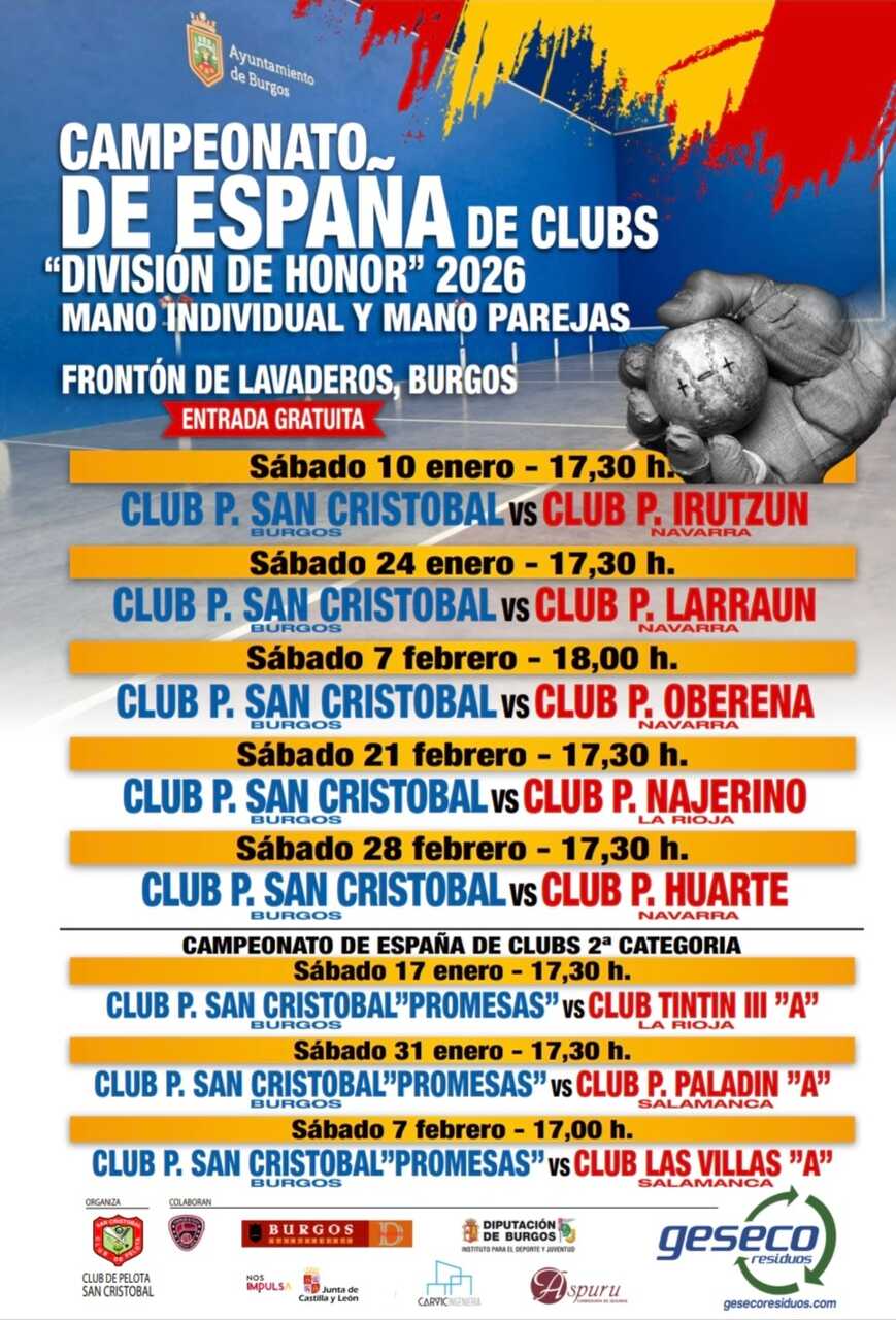 El CP San Cristóbal comienza el Campeonato de España de Clubes de División de Honor con la disputa de la primera jornada de este próximo sábado 10 de enero, a las 17:30 horas en el Frontón de Lavaderos, donde se medirá al potente Club Pelota Irurtzun de Navarra.
