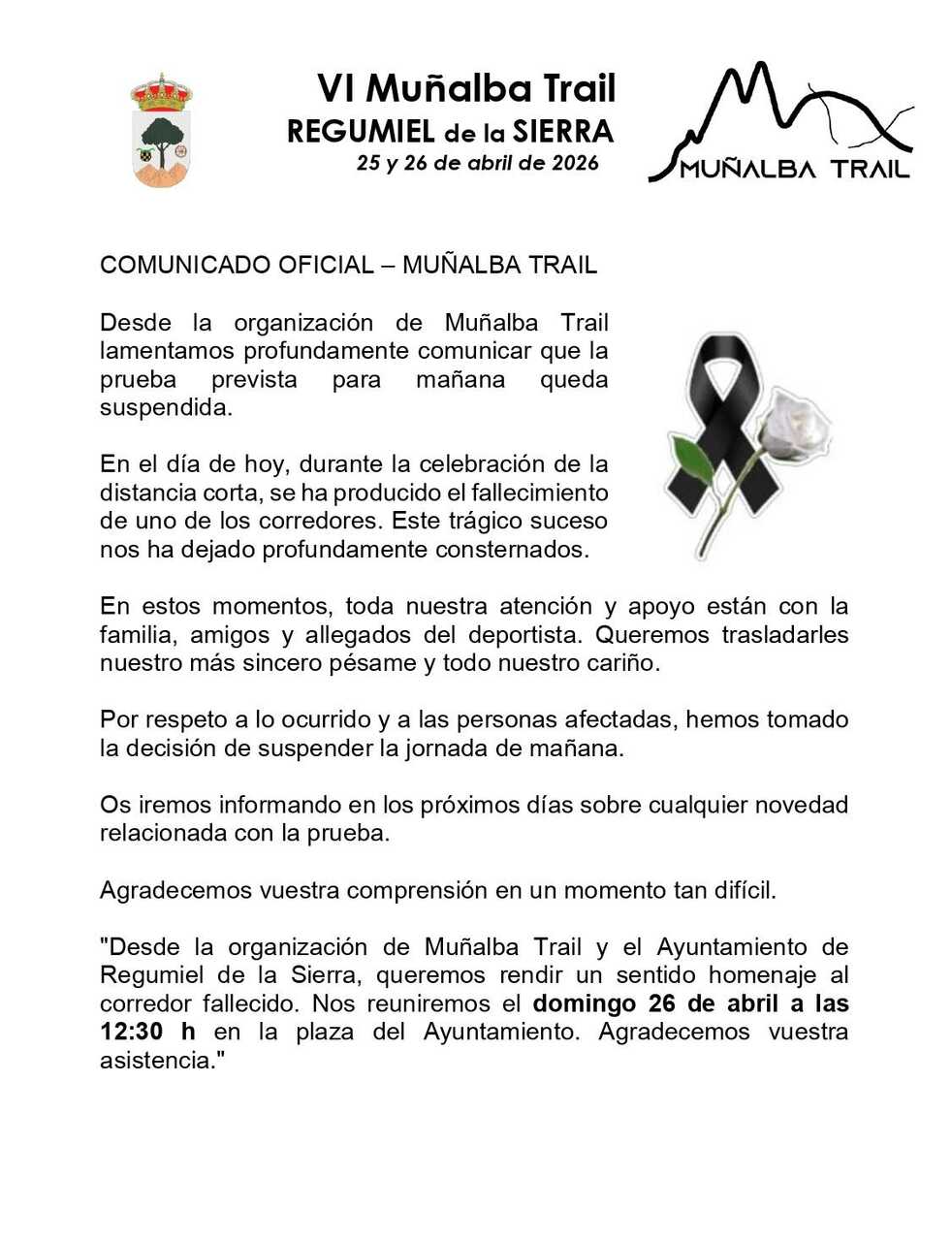 En el comunicado oficial redactado por la organización, se daba a conocer la muerte de un participante en la distancia corta de hoy sábado 25 de abril, que ha llevado a la suspensión de la jornada de mañana domingo 26 de abril. Si hay previsto rendir homenaje al corredor fallecido, a las 12:30 horas, en la plaza de Regumiel de la Sierra
