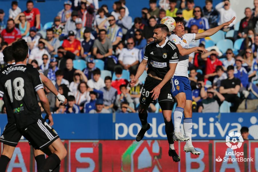 La segunda mitad arrancó con un ritmo ligeramente inferior a la primera y con demasiada precipitación en las acciones ofensivas de ambos conjuntos, que morían en la frontal del área sin saltar las alarmas en los guardametas. La primera ocasión completada fue para los nuestros, Pablo Valcarce internó en busca del balón y cayó, quizás derribado por su marcador, al intentar rematar sobre puerta. En la siguiente acción respondieron los maños, pero el centro de Borja Sainz desde la lateral izquierda del área se perdió demasiado desviado. Los blanquinegros seguían empujando para perforar la portería de Álvarez, pero el meta zaragozano ataja bien los disparos sobre puerta, como el de Córdoba cargando desde la frontal del área en el minuto sesenta. El propio Álvarez protagonizaría la mejor para del encuentro al despejar a la esquina un potente disparo escorado de Guillermo, internando por la banda izquierda del ataque burgalés.