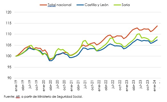 Evolución de los afiliados registrados a la Seguridad Social en Soria, Castilla y León y España (Base 100 =2019)