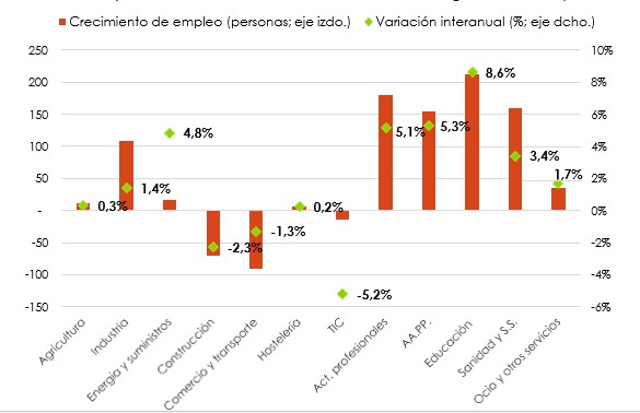 En el lado opuesto, el empleo del sector de la construcción en Soria registró una reducción interanual del 2,3% en abril. Ello representa una pérdida de 70 puestos de trabajo en un sector que había registrado anteriormente una tendencia positiva y que, en general, adolece de falta de mano de obra.