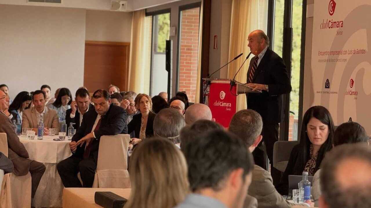La Cámara de Comercio de Soria ha celebrado, el viernes 10 de abril, un nuevo encuentro del Club Cámara con la participación de Luis de Guindos, vicepresidente del Banco Central Europeo, en el Parador Antonio Machado. La cita ha reunido a más de 130 empresarios y empresarias socios del Club Cámara en un formato de diálogo directo centrado en la situación económica europea y sus implicaciones para el tejido empresarial.
