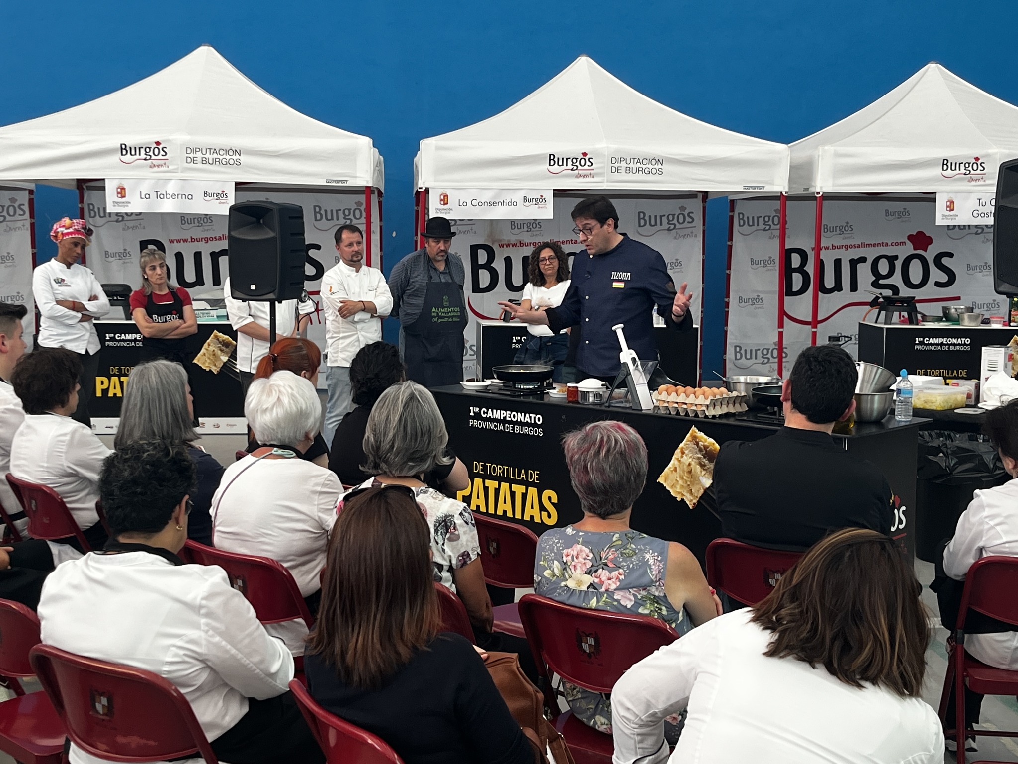 Antes de la elaboración de las tortillas para el concurso, el público pudo disfrutar de ponencias y demostraciones en vivo de los mejores en esta materia Carlos Olabuenaga, Pedro José Román y Alberto García Ponte, campeones nacionales en la elaboración de tortilla de patatas.