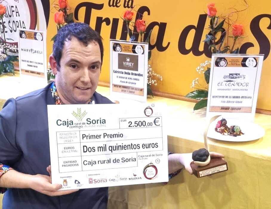 Luis Alberto Simón, natural de Duruelo de la Sierra y chef de El Cenador de Quintanar de La Sierra, ha conseguido el primer Premio del Concurso Gastronómico Nacional de la Trufa Negra, desarrollado en la tarde-noche del sábado 14 de febrero. Luisal ha ganado el certamen anual con el plato 'Bosque trufado'.