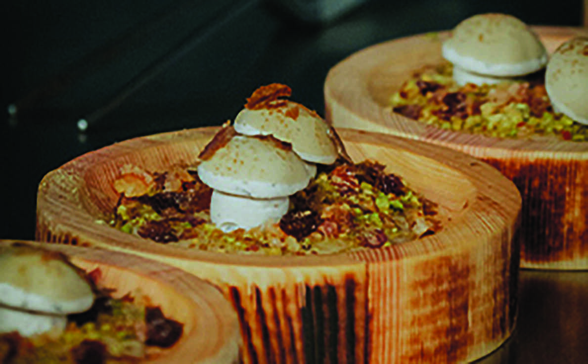 Para esta propuesta, se han utilizado cuatro productos muy importantes en la gastronomía soriana: boletus, trufa, foie y el torrezno. Se compone de una cama de crema de boletus, pistacho que simula el musgo, unas pasas que simulan las piedras y el torreznillo para simular el tono más marrón. Para los dos boletus, que recordemos que se trata de un trampantojo y por tanto, es la simulación del nacimiento de unos boletus, se utilizará para el pie queso trufado, que le aporta ese color blanco y para la cabeza foie, a la cuál también se le simularán unas esporas. Para finalizar, el chef acompañó su tapa con vino de la Bodega soriana De Postín.