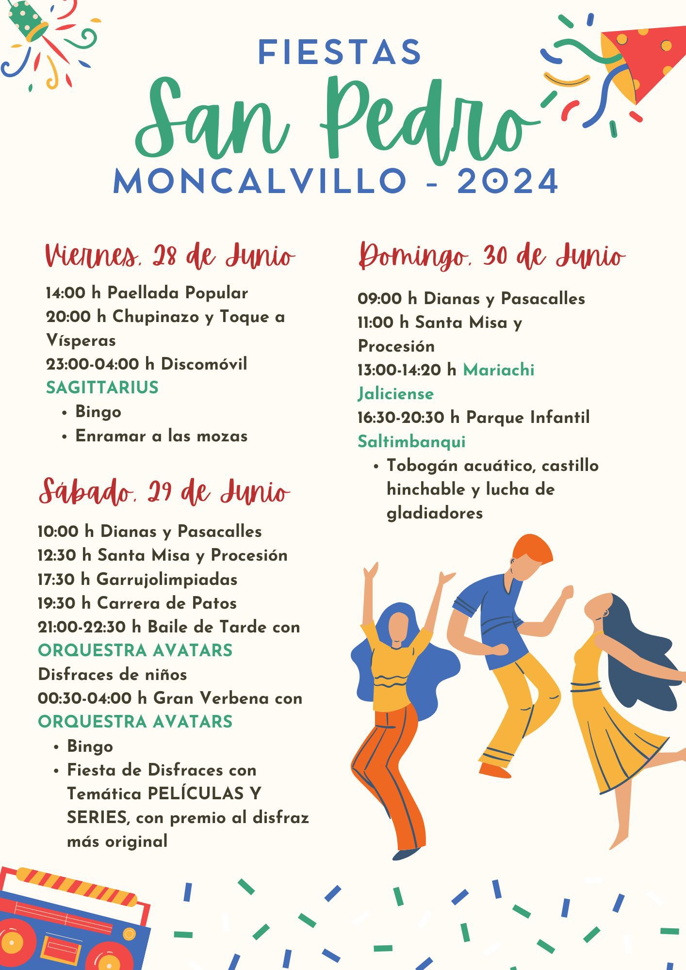 A las 17:30h Garrujolimpiadas organizadas por los jóvenes de Moncalvillo que hacen las delicias de todos los asistentes y participantes donde se combinan diferentes pruebas que cambian todos los años y combinan habilidad, fuerza, destreza... y donde lo que no faltan son las risas y el buen ambiente. A las 19:30h tocará el turno a niños y mayores con el juego en el río de la carrera de partos. Una actividad lúdica para pasar una tarde diferente y entre sonrisas. A las 21h. empezará el baile de tarde con la orquesta 'Avatars', y el concurso de disfraces para los niños. A las 00:30h gran verbena en la plaza con bingo en el intermedio y con la idea de que todos los asistentes acudan disfrazados de 'Películas y Series' con premio al disfraz más original.